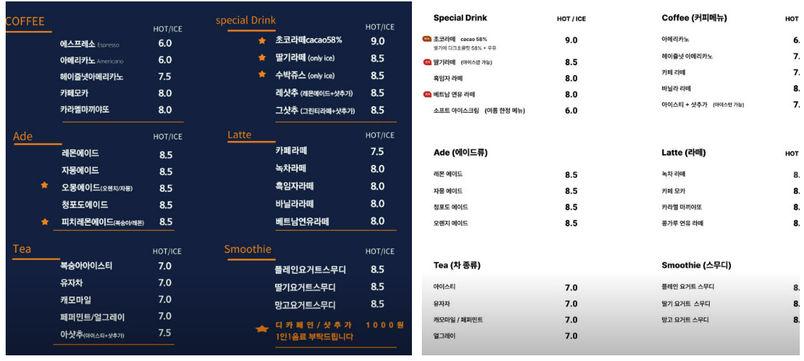 초콜릿 음료뿐만 아니라 커피, 에이드, 차, 스무디까지 다양한 음료를 판매하고 있어 취향에 따라 선택할 수 있습니다. 특히 커피 메뉴도 신경 써서 구성되어 있으며, 기본 아메리카노부터 카라멜 마끼아또, 바닐라 라떼 등 다양한 라떼 종류까지 고루 갖추고 있습니다. 덕분에 초콜릿을 좋아하지 않는 사람도 방문해 즐길 수 있습니다.