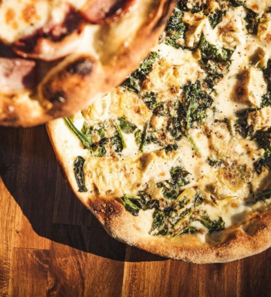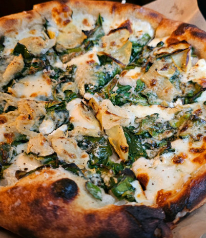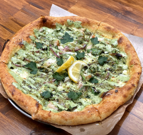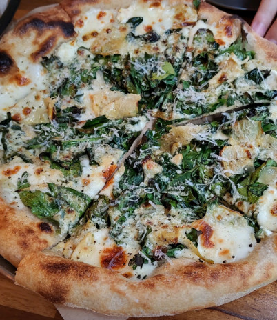 치킨과 페스토, 남해 시금치, 적양파, 염소치즈가 조화를 이루는 피자로 고소한 맛이 특징입니다. 도우는 바삭하게 구워져 씹을 때마다 고소함이 배가되며, 페스토의 상큼한 풍미와 치즈의 진한 맛이 어우러져 완성도 높은 조합을 보여줍니다. 특히 시금치와 염소치즈의 조합이 건강한 느낌을 주어 담백하면서도 깊은 풍미를 즐길 수 있습니다.