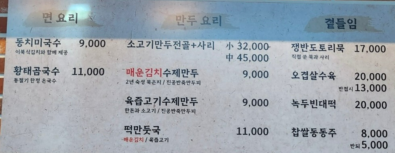 백반기행 남양주 함경도식 동치미국수 김치만두 맛집의 메뉴