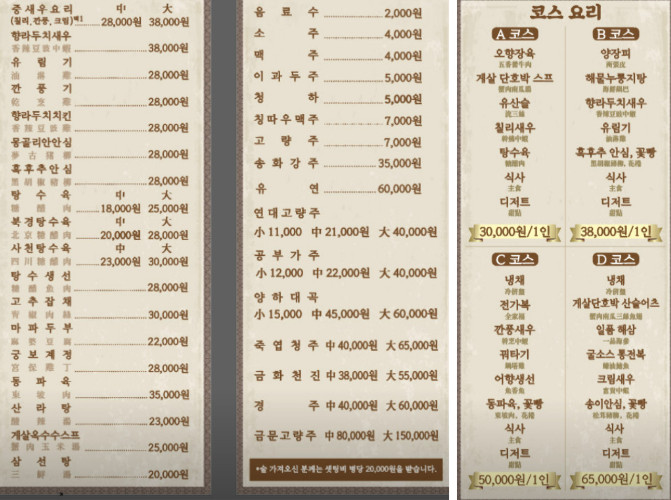 다양한 코스 요리도 백반기행 성시경 중화요리 맛집의 매력입니다. A코스부터 D코스까지 다양한 선택지가 있으며, 코스마다 독특한 메뉴 구성이 돋보입니다. 특히 D코스는 고급 요리가 포함되어 있어 특별한 날을 기념하기에 완벽한 선택이 될 수 있습니다. 코스 요리는 풍부한 양과 정갈한 맛으로 손님들의 발길을 끌고 있습니다.