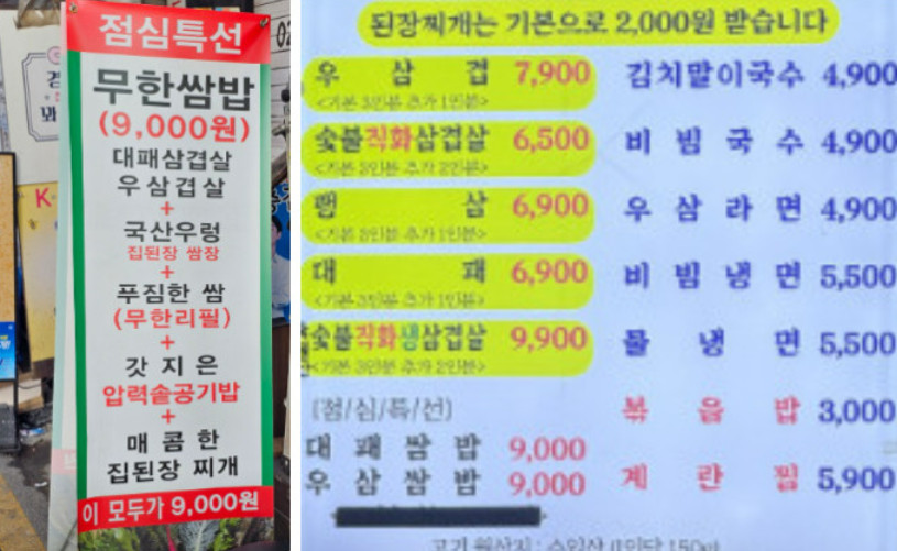 생방송투데이 막퍼주는 집 9000원 쌈밥정식 맛집은 고기의 질과 맛에서 타협하지 않으면서도 착한 가격을 유지합니다. 6,500원부터 시작하는 삼겹살과 4,900원의 국수 메뉴들은 부담 없이 즐길 수 있는 점에서 특히 매력적입니다. 합리적인 가격에 푸짐한 양을 제공하여 맛과 가성비를 모두 만족시킵니다. 가족, 친구, 연인과 함께 식사하기에도 적합한 가격대로 손님들에게 좋은 인상을 남깁니다.