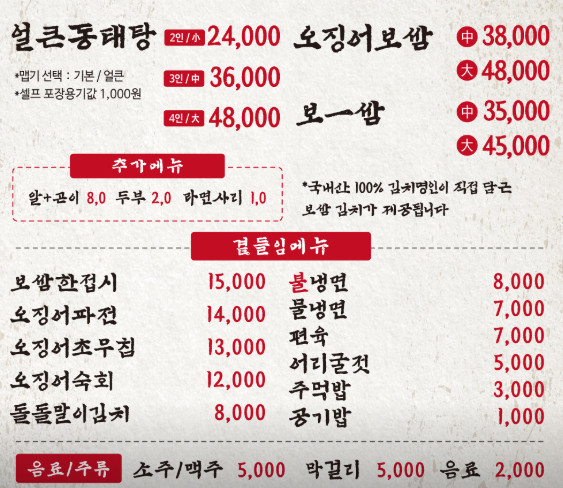 생방송투데이 양푼 동태탕 신도림 맛집의 메뉴들은 가격 대비 양이 넉넉하게 제공됩니다. 얼큰양푼 동태탕, 보쌈, 오징어보쌈 모두 한 접시에 푸짐한 양이 담겨 나오며, 한 끼 식사로 든든하게 즐길 수 있습니다. 특히 보쌈은 중, 대 사이즈로 선택할 수 있어 여러 명이 함께 나눠 먹기 좋으며, 국물 요리도 2~4인 기준으로 선택할 수 있어 가족 단위 방문객들에게 인기가 많습니다.
