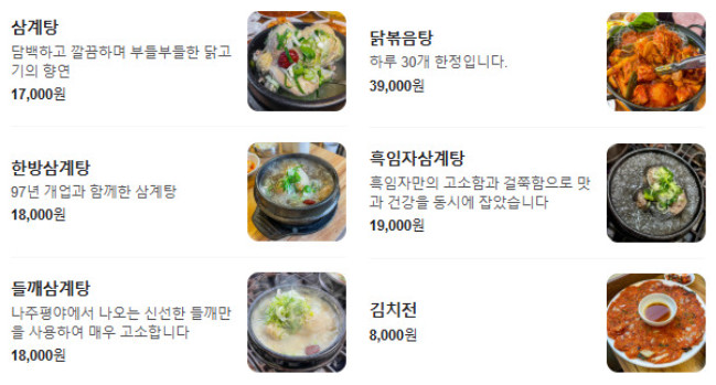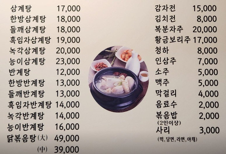 삼계탕 전문점답게 모든 메뉴가 삼계탕 베이스라 선택의 폭이 넓었습니다. 평소 삼계탕을 좋아한다면 한 번쯤 방문해볼 만한 곳입니다.