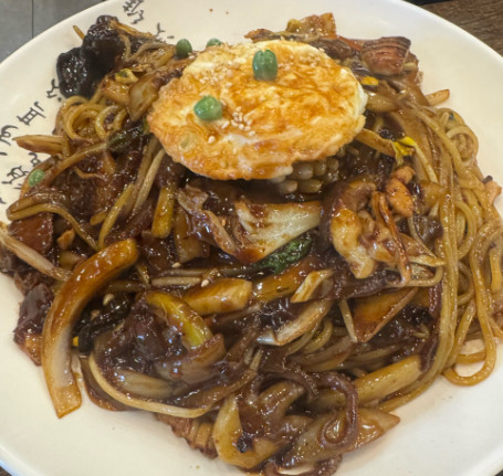 일반적인 짜장면과는 차원이 다른 맛을 자랑하는 생생정보 고수의부엌 통문어짬뽕전골 맛집의 바람돌이짜장은 특별한 비법 소스로 볶아내 깊고 진한 풍미를 자랑합니다. 불맛이 가미된 짜장 소스가 면발에 골고루 배어 있어 감칠맛이 남다르며, 달콤하면서도 짭짤한 맛의 조화가 일품입니다.