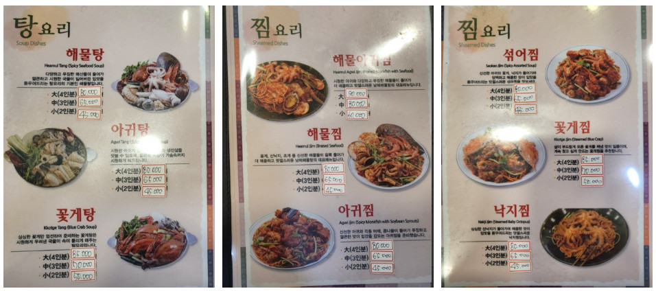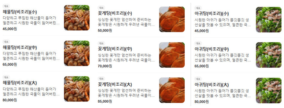 해물탕, 꽃게탕, 아귀탕 모두 소, 중, 대 사이즈로 준비되어 있어 손님 수에 따라 유동적으로 선택할 수 있습니다. 단체 손님부터 소규모 가족까지 다양한 니즈를 충족할 수 있는 점이 이곳의 매력입니다. 여러 가지 해산물을 함께 즐길 수 있어 누구와 함께 방문해도 만족스러운 식사가 가능합니다.