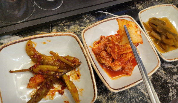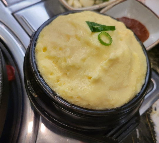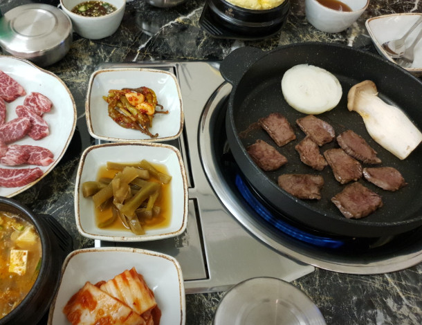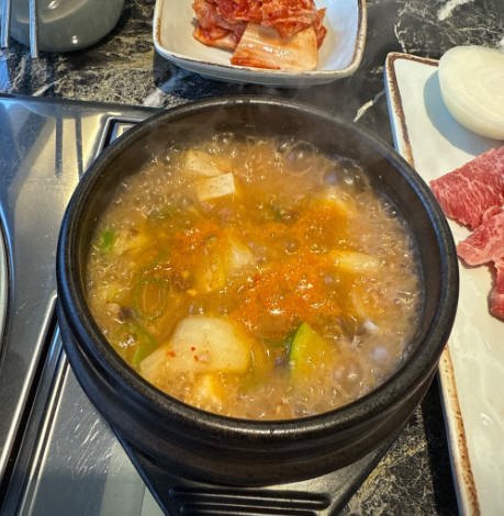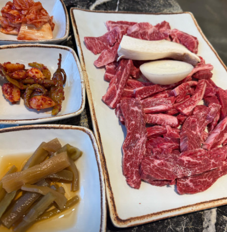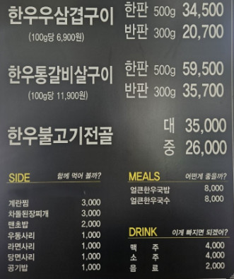 한우삼겹구이를 주문했는데, 마블링이 좋고 불판에서 구우니 육즙이 살아 있어 정말 맛있었습니다.