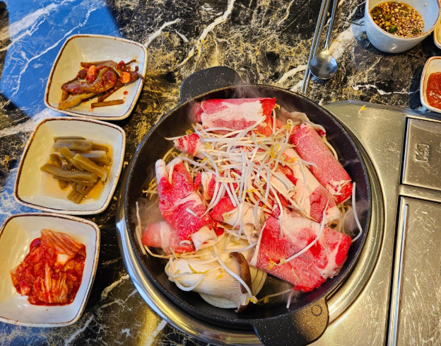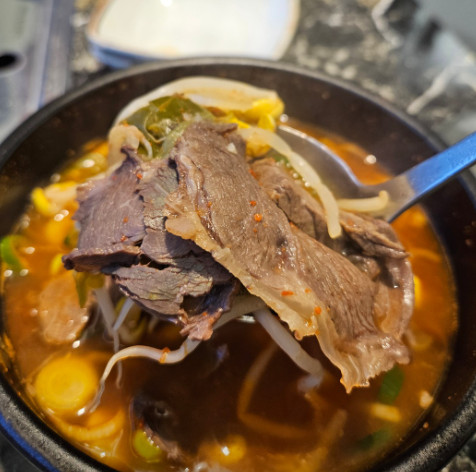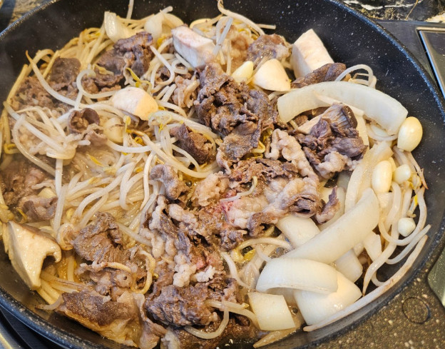 한우불고기전골을 먹었는데, 양념이 과하지 않아 고기 본연의 맛을 즐길 수 있어 좋았습니다. 국물도 맛있어서 국밥처럼 밥을 말아 먹었습니다.
