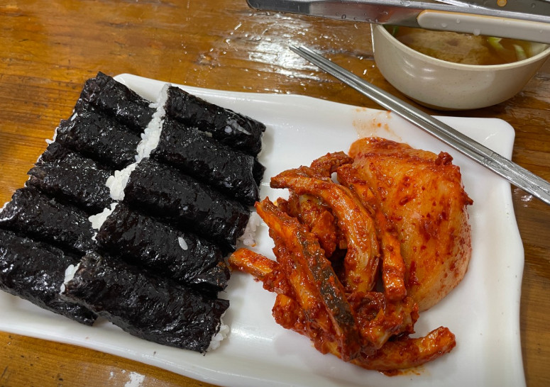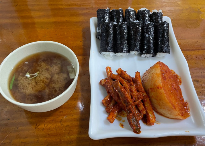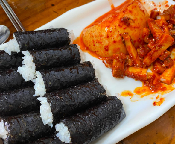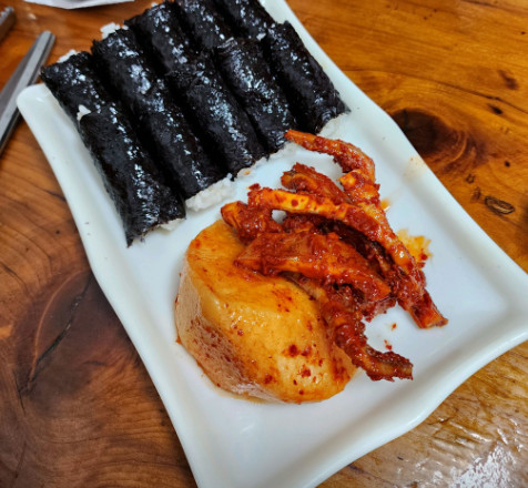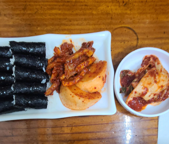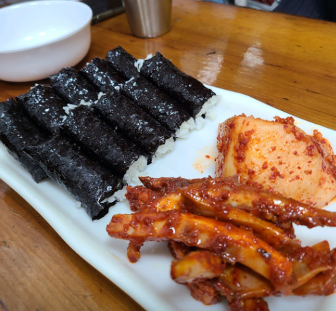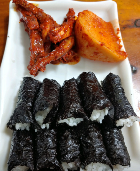 김밥이 밥만 들어가 있어서 처음에는 어색했지만, 오징어무침과 무김치랑 먹으니 정말 조화롭고 맛있었습니다.